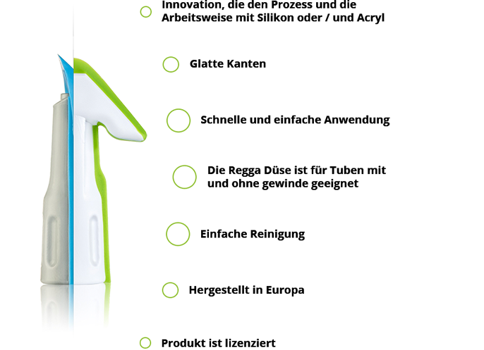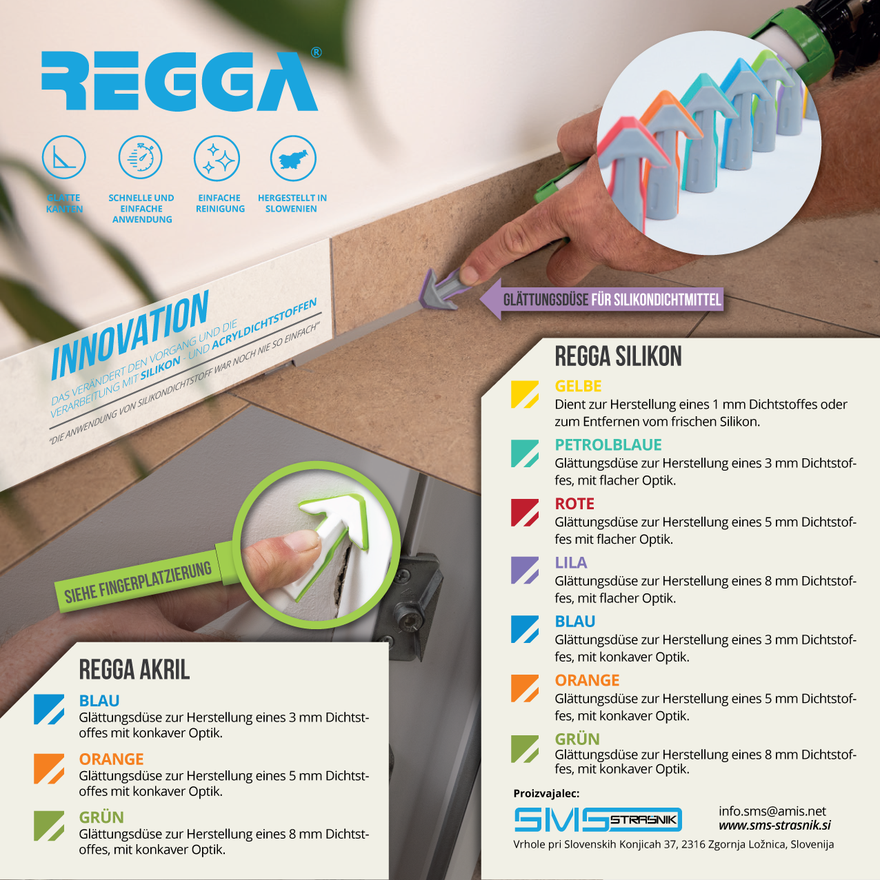 REGGA ist ein hochwertiges und technisch einwandfreies Produkt, das beim Auftragen von Silikon- oder Acryl-Dichtmassen hilft. Sie werden von Handwerkern eingesetzt, die nur gelegentlich Projekte in ihrem Zuhause durchführen und solchen, die sich beruflich mit Dichtmassen auseinandersetzen.