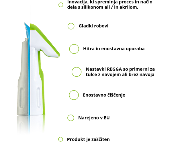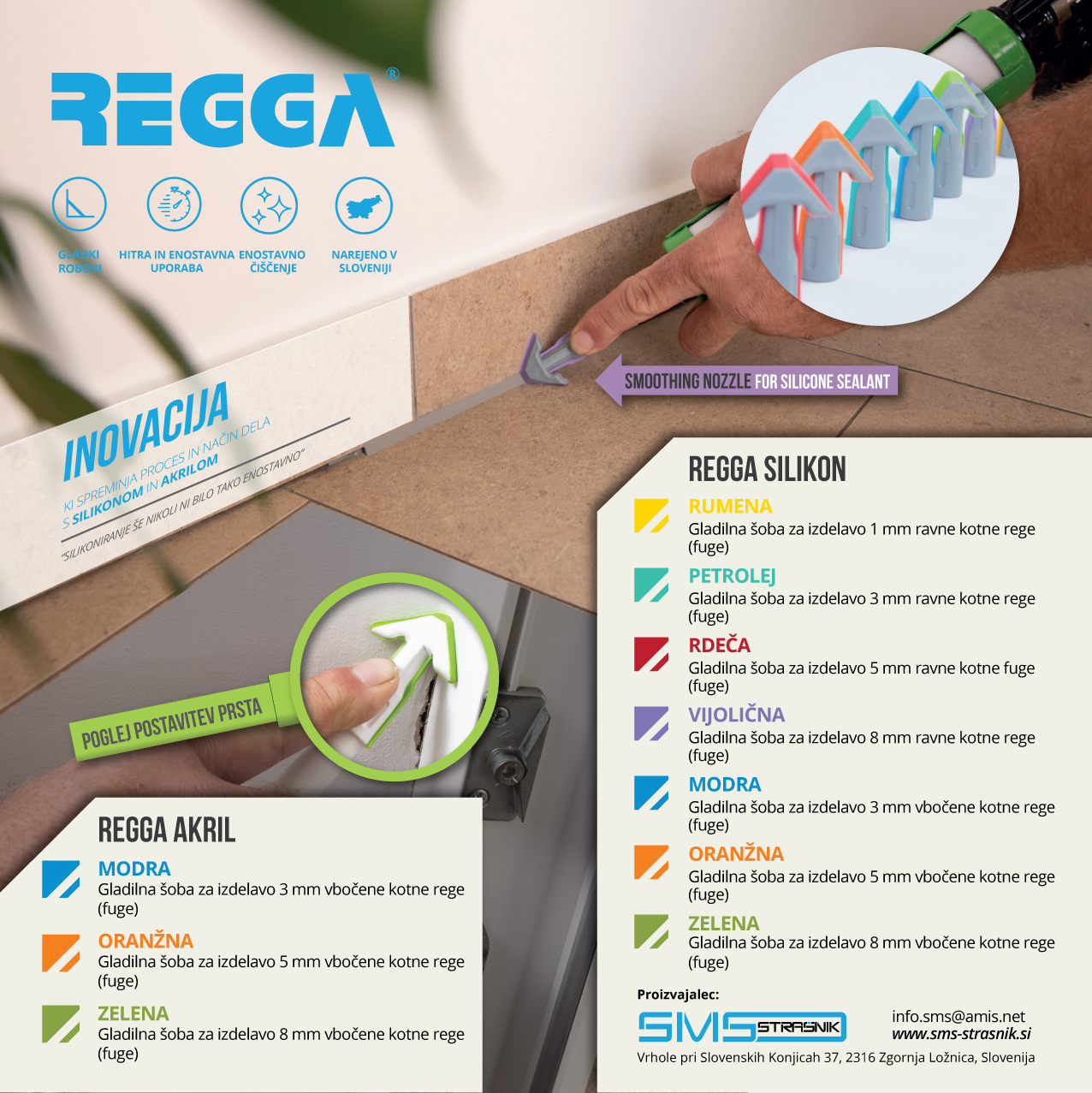 REGGA je visoko kakovosten in tehnično dovršen produkt, ki pomaga pri nanosu silikonskih ali akrilnih tesnilnih mas. Uporabljajo jih tako mojstri, ki se le občasno lotevajo projetkov v svojem domu, kot tisti, ki se srečujejo s tesnilnimi masami profesionalno.